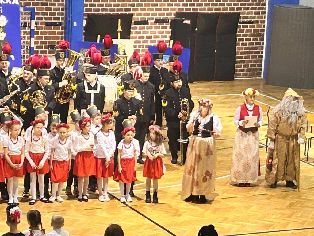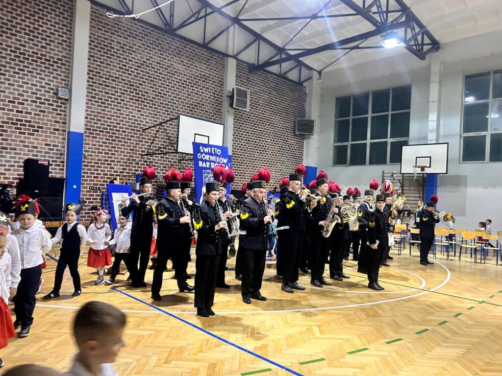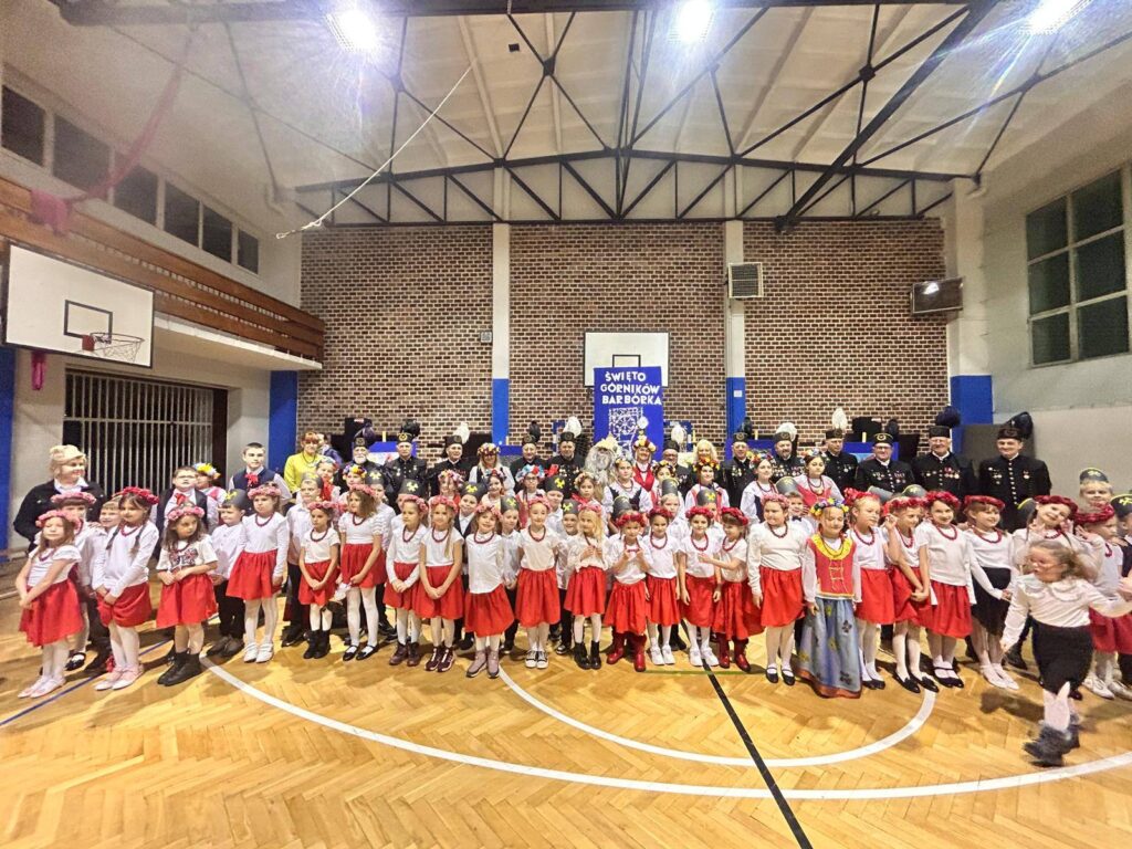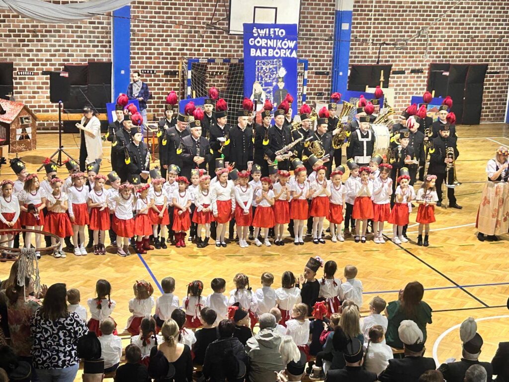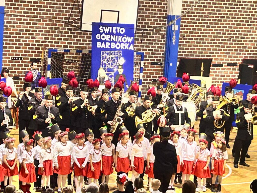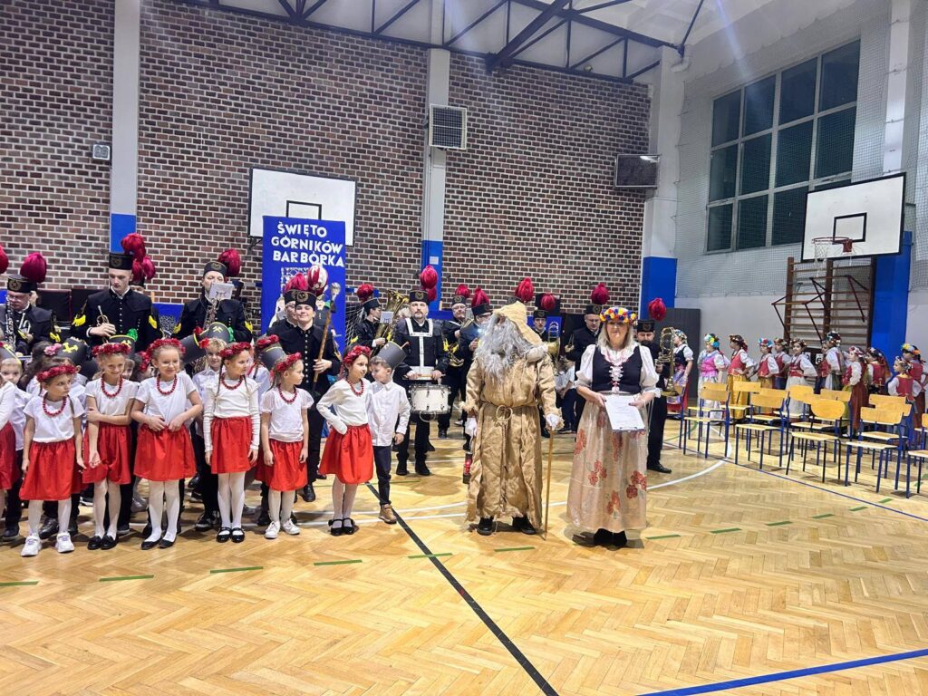Grupa uczniów z klasy 1c, 1d, zespół Sośniczanie, PM nr 22, ZPM nr 1 uczciła ważne święto Dzień Górnika.