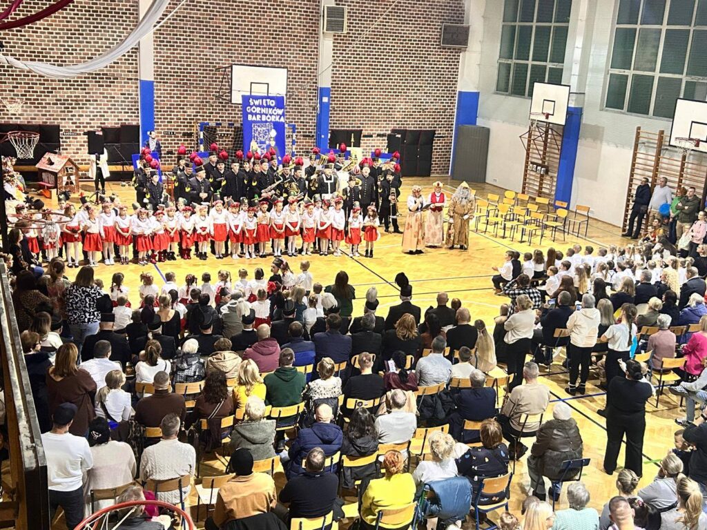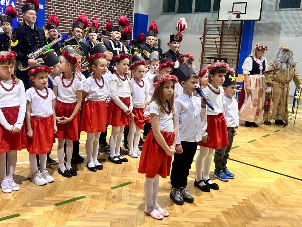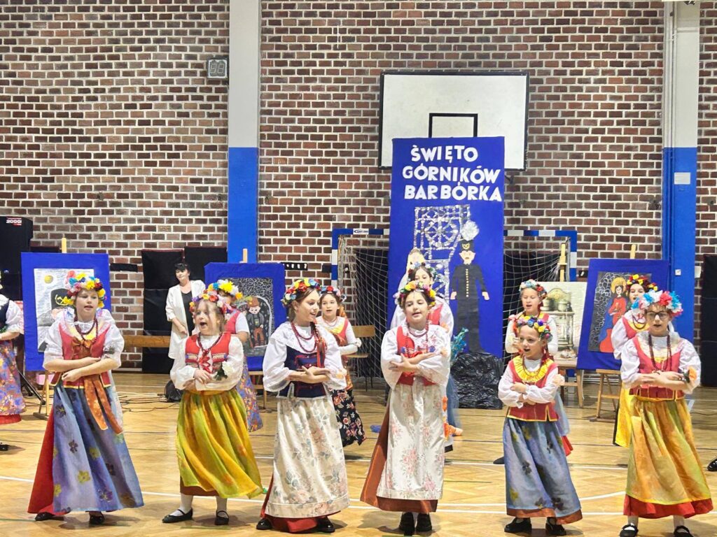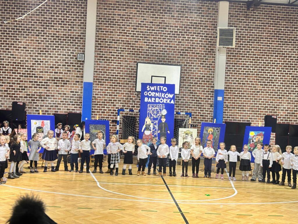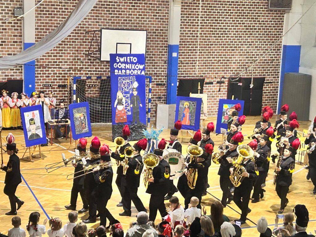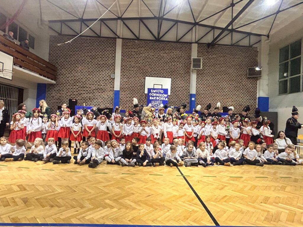 Grupa uczniów z klasy 1c, 1d, zespół Sośniczanie, PM nr 22, ZPM nr 1 uczciła ważne święto Dzień Górnika.