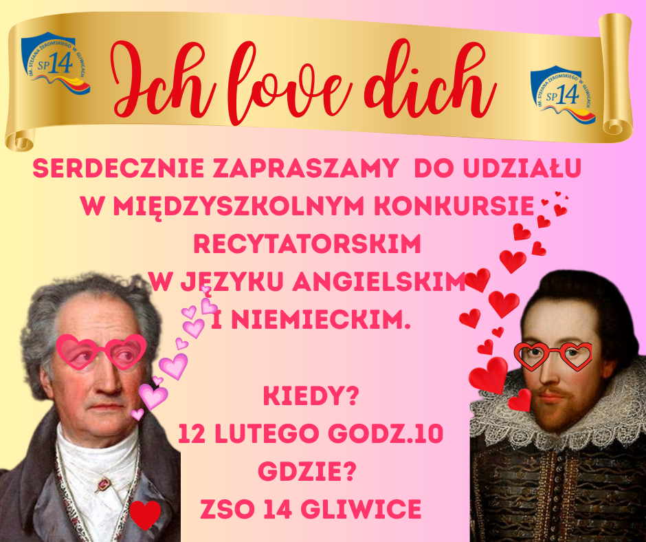 Serdecznie zapraszamy uczniów szkół podstawowych do udziału w Międzyszkolnym Konkursie Recytatorskim w języku angielskim i niemieckim ,,Poetyckie walentynki w 14” – „Ich love dich” 12 lutego 2026 r. w godzinach 10-14, w Zespole Szkół Ogólnokształcących w Gliwicach.