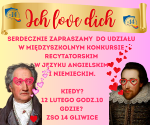 Serdecznie zapraszamy uczniów szkół podstawowych do udziału w Międzyszkolnym Konkursie Recytatorskim w języku angielskim i niemieckim ,,Poetyckie walentynki w 14” – „Ich love dich” 12 lutego 2026…
